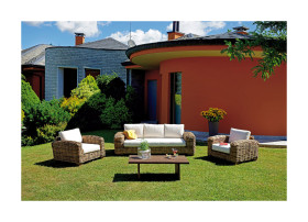 Salottino da esterno dallo stile etnico e design contemporaneo, ideale per una zona relax accogliente in giardino o terrazzo.