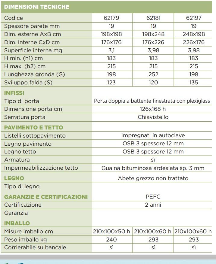 Queste ultime, oltre ad avere una grande valenza estetica, fungono da isolante e proteggono l?ambiente interno dall?umidità, rendendo questa casetta un prodotto di elevata qualità, in grado di soddisfare tutte le vostre esigenze. A questo contribuiscono indubbiamente le sue dimensioni - 248x198x217cm ? che vi permetteranno di avere tanto spazio da dedicare alla custodia di vari attrezzi da giardino e bricolage, sfruttando l?ambiente anche in altezza.