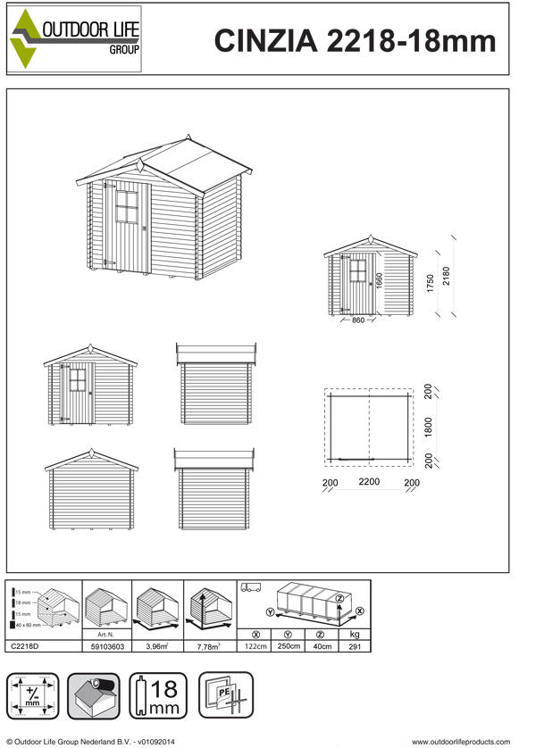 Questa casetta è provvista di pavimento 2,16 x 1,76 m con un'altezza massima del tetto di 2,20 m; perfetta anche per oggetti ingombranti o attrezzi dai manici alti.
