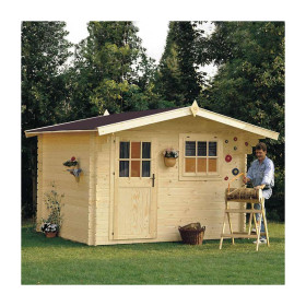 Casetta in legno di abete blockhaus 300 x 250 cm con spessore pareti 28 mm. L'ampio spazio esterno e le vetrate la rendono sfruttabile internamente come una vera e propria stanza ed adatta a qualsiasi utilizzo.