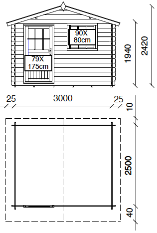 - Dimensioni esterne: 318x268 cm, interne: 294x244 cm, tetto: 350x300 cm (7,5 Mq)