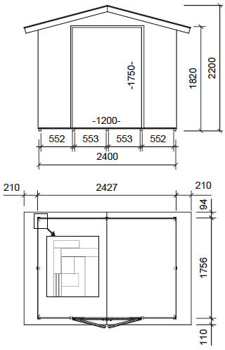 Questa casetta è provvista di pavimento 2,40 x 1,76 m con un'altezza massima del tetto di 2,20 m: perfetta anche per oggetti ingombranti o attrezzi dai manici alti.