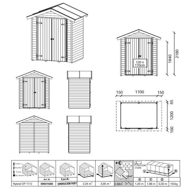 Questa casetta è provvista di pavimento 1,20 x 1,70 cm con un'altezza massima del tetto di 2,26 mt: perfetta anche per oggetti ingombranti o attrezzi dai manici alti.