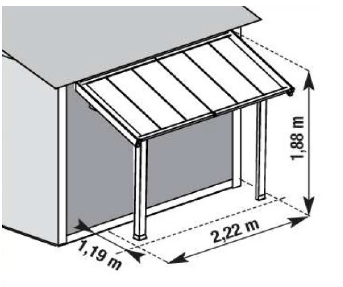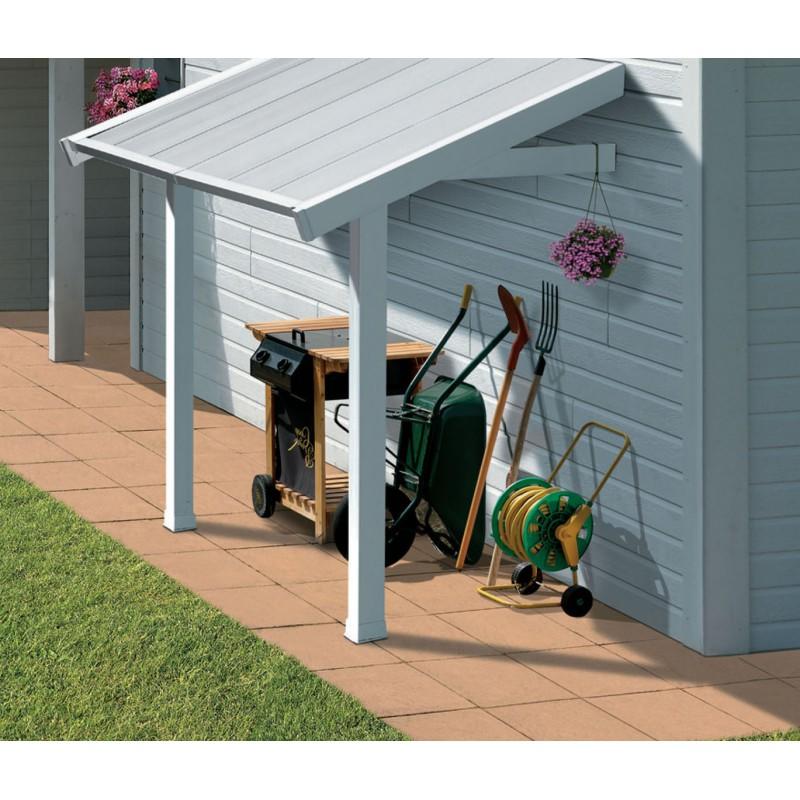 Tettoia laterale in PVC (2,64 mq) Altezza tettoia 1,41 cm x larghezza 2,22 cm x profondità 1,19 cm. Tettoia color grigio chiaro, pali bianchi. Solo per casette Grosfillex da 7 mq e 11 mq.