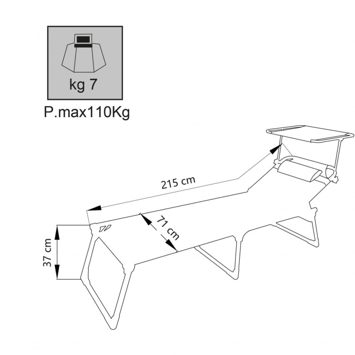 Disponibile AZZURRO o GRIGIO struttura Ø 30 x 20 mm, portata max 110 kg, tessuto in textilene 2 x 1 con cuscino Dimensioni: cm 215 x 71 x 37 h