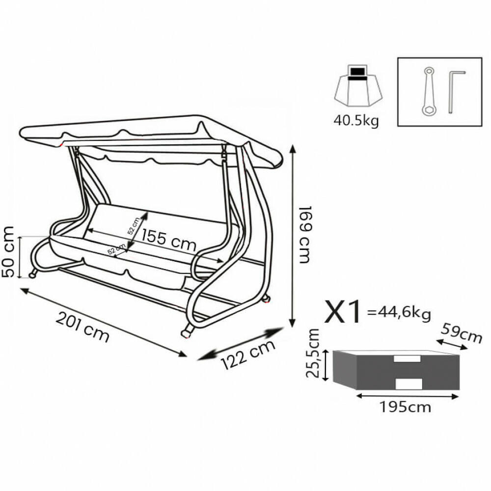• Dati Tecnici Telo poliestere 160 gr BEIGE cuscino BEIGE struttura in metallo nero opaco tubi ? 50/32/28/18 mm Dimensioni: cm 202 x 114 x 169 h