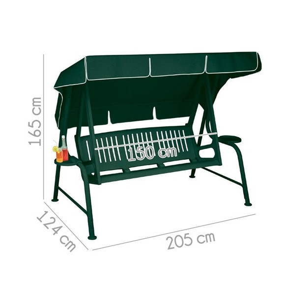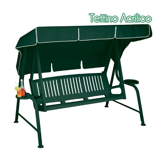Dondolo 3 posti in resina verde. Struttura portante in acciao plastificato con portabibite ? Seduta, schienale e spalle laterali in resina ? Tettuccio in tessuto acrilico ? Senza cuscini ? Dimensione: cm.205?124 h.165 Ottima qualità