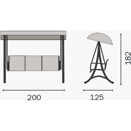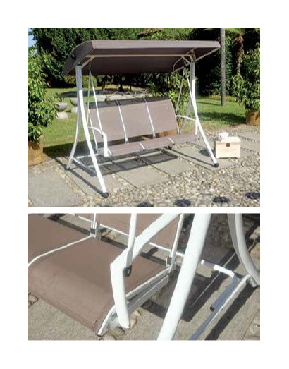 Dondolo a tre posti con struttura in ferro bianco. Seduta in textilene color tortora, tettuccio in poliestere color tortora.