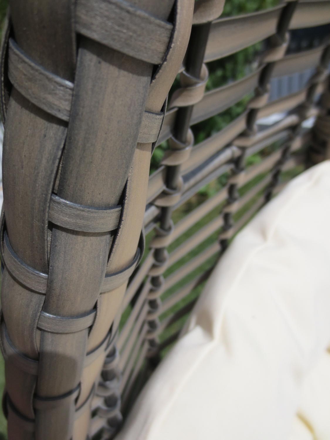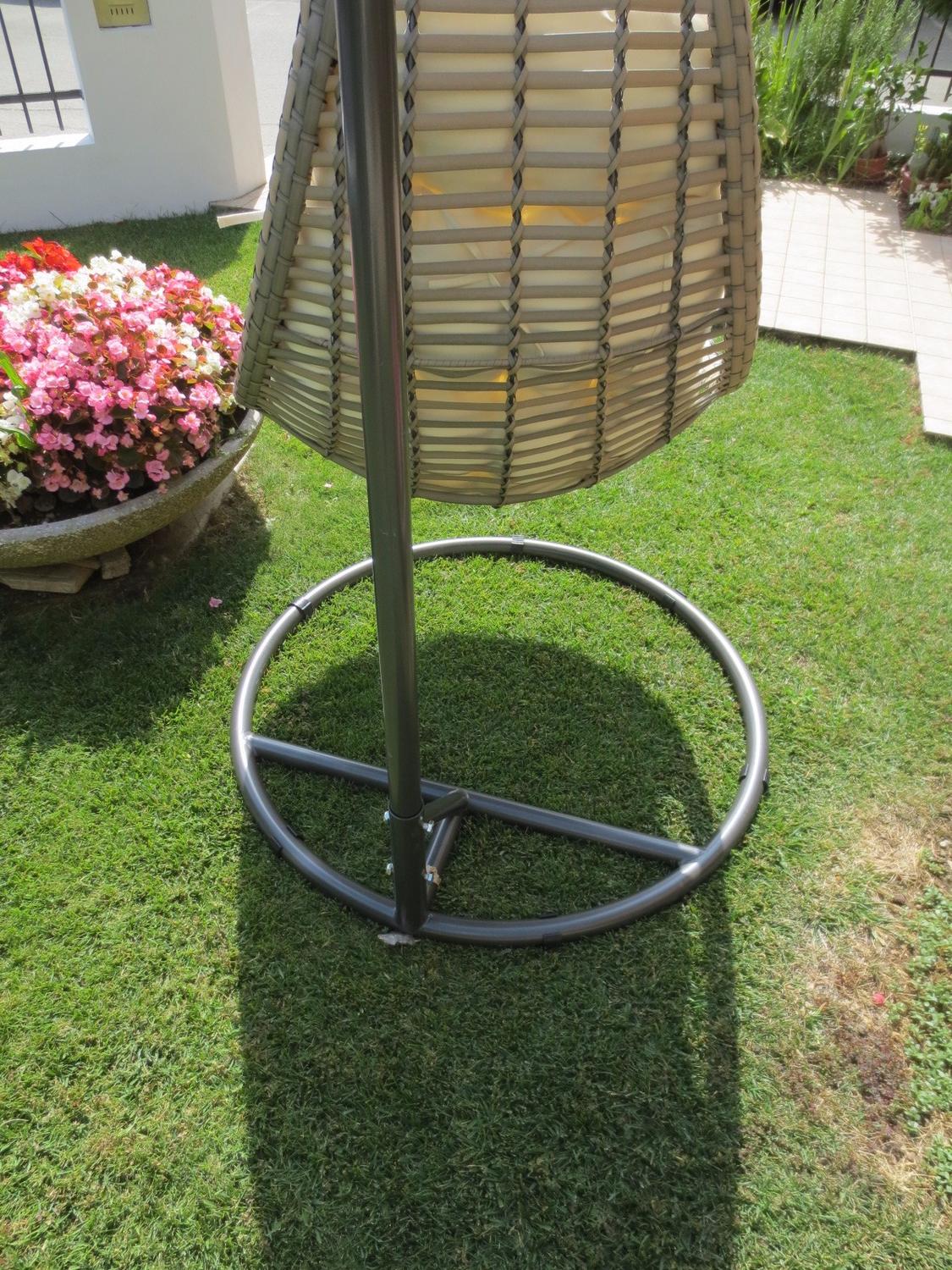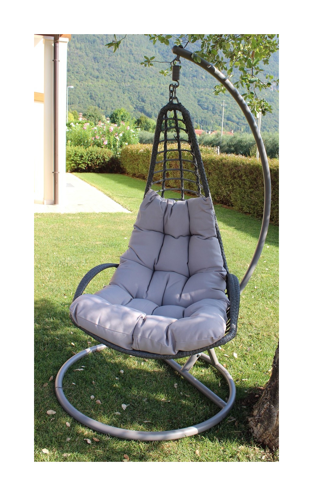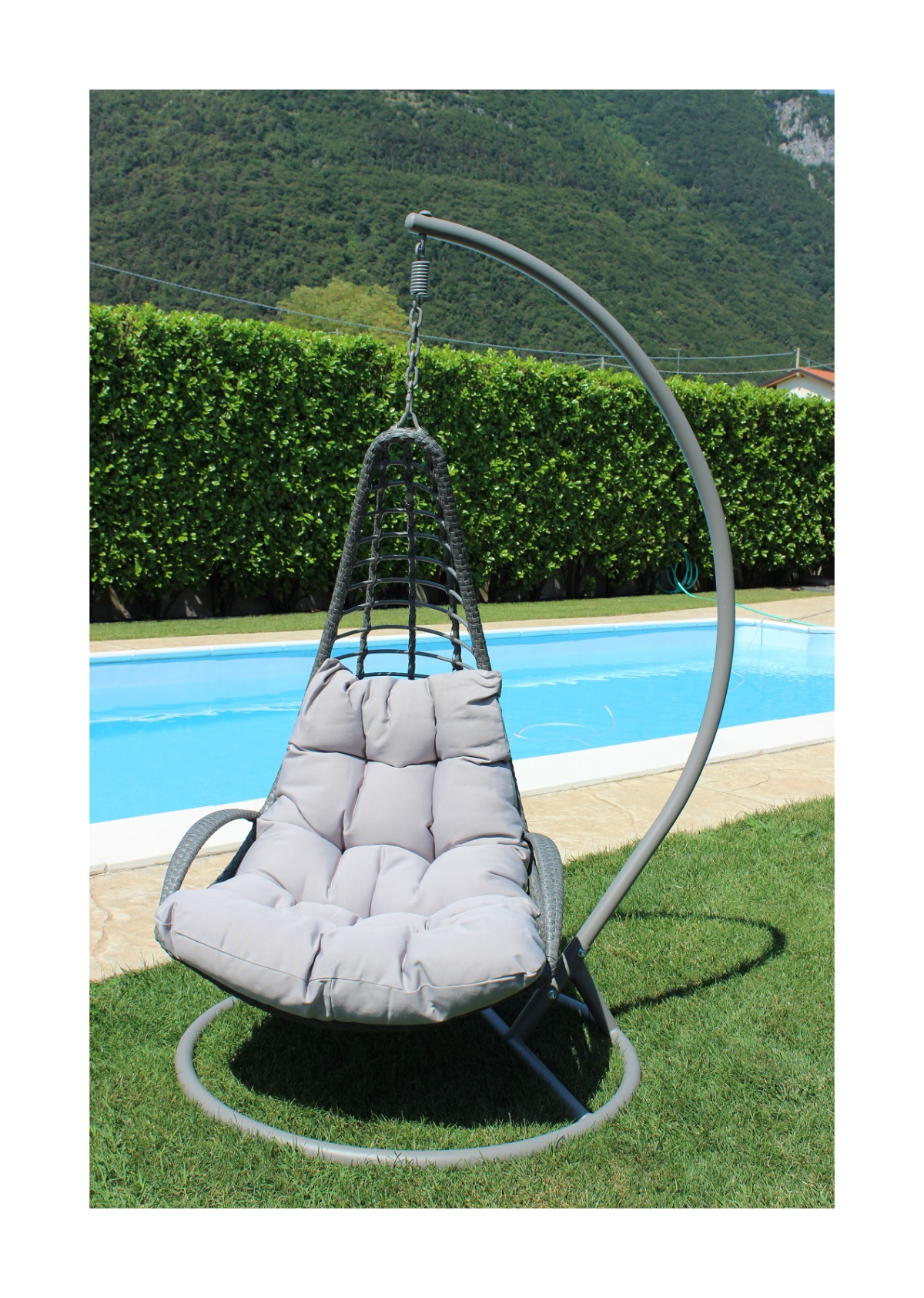 Poltrona sospesa dondolante in polyrattan spazzolato avano da 12 mm con morbidissimo cuscino imbottito color sabbia per creare una zona relax dal comfort ottimale.