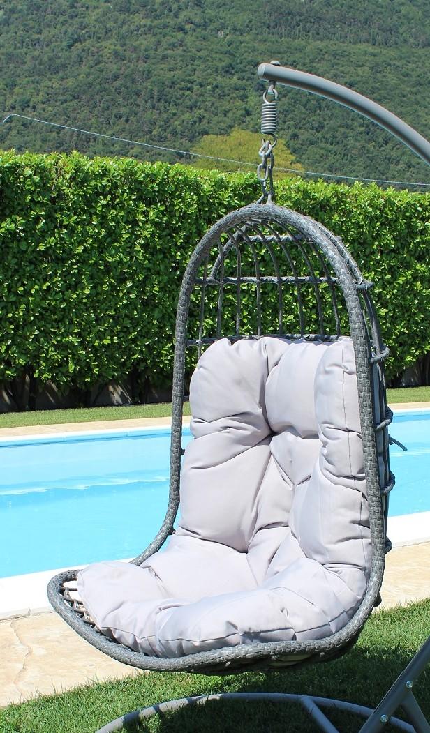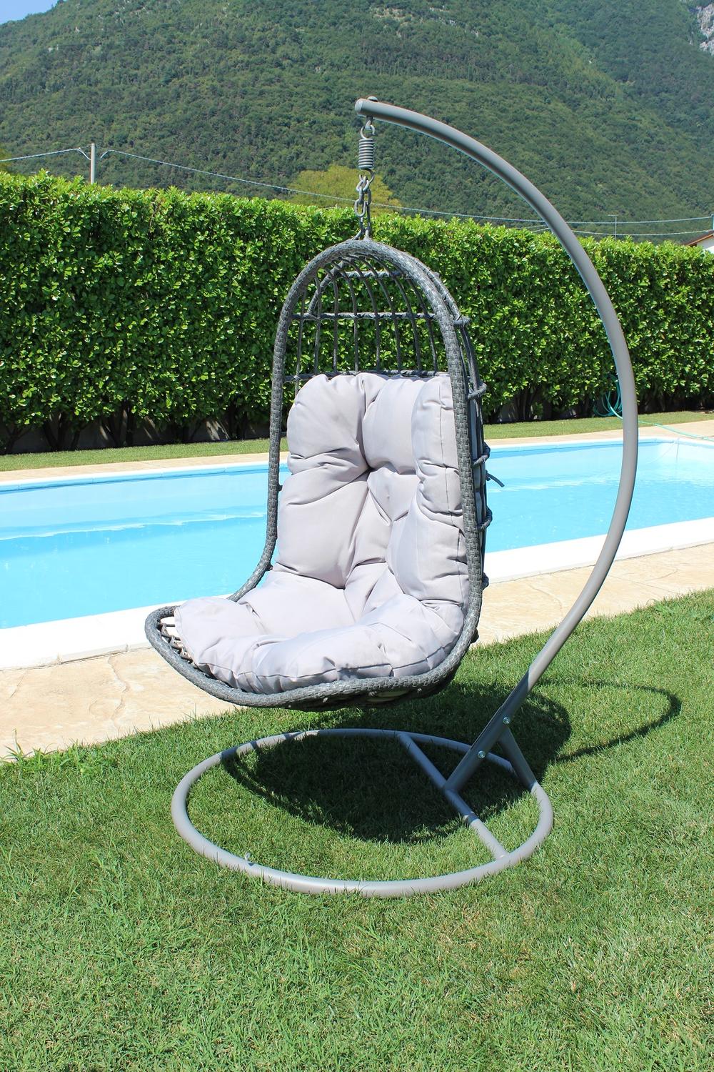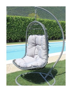 Perfetta anche come poltrona da giardino, dondola dolcemente al vento, appesa a una base in metallo rivestita di vernice epossidica.