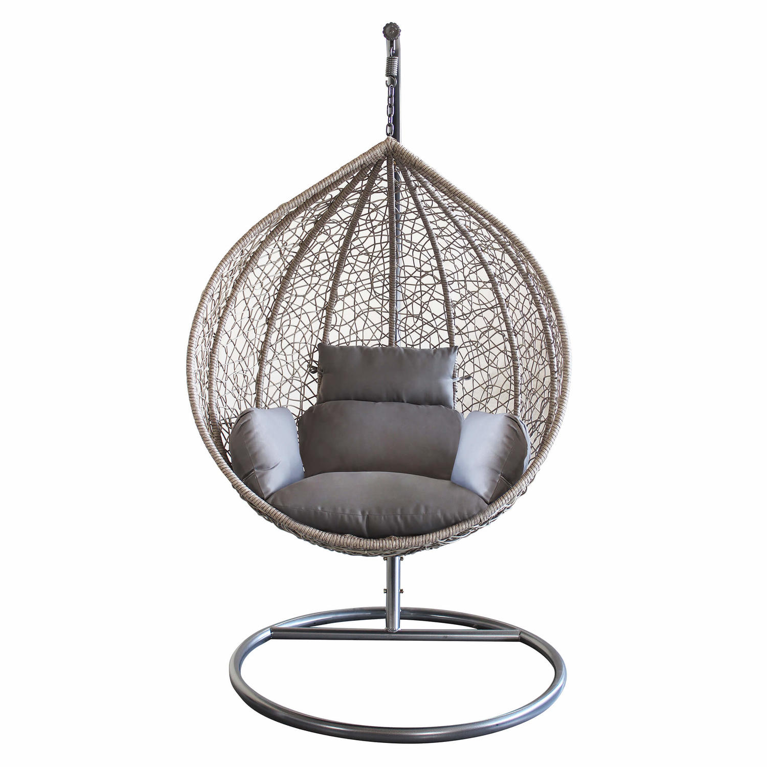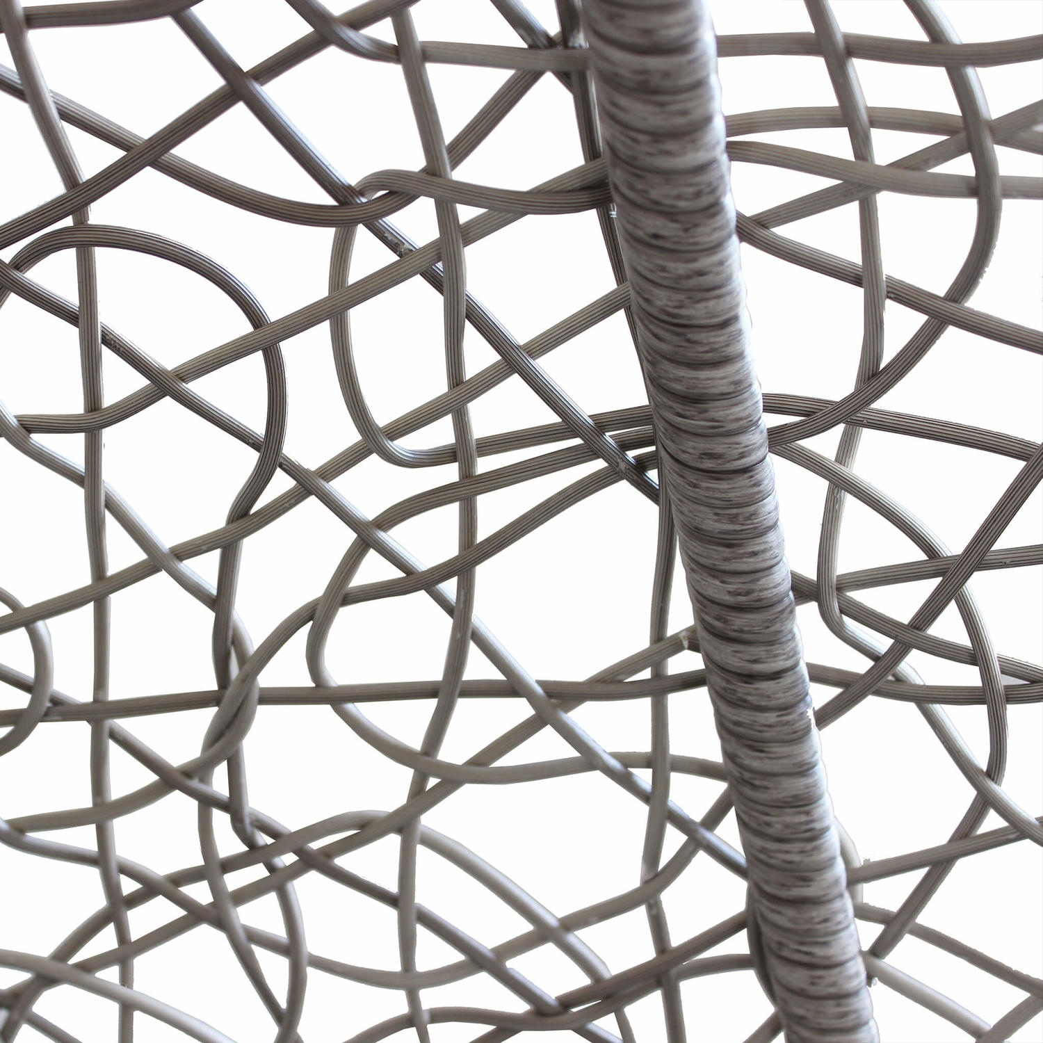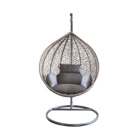 Poltrona sospesa dondolante in polyrattan spazzolato con morbidissimo cuscino imbottito color sabbia per creare una zona relax dal comfort ottimale.