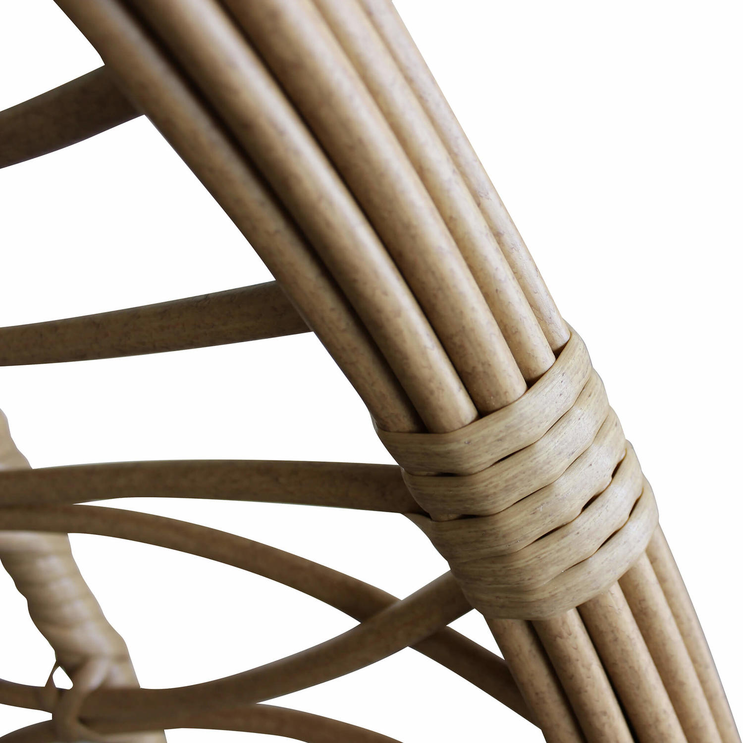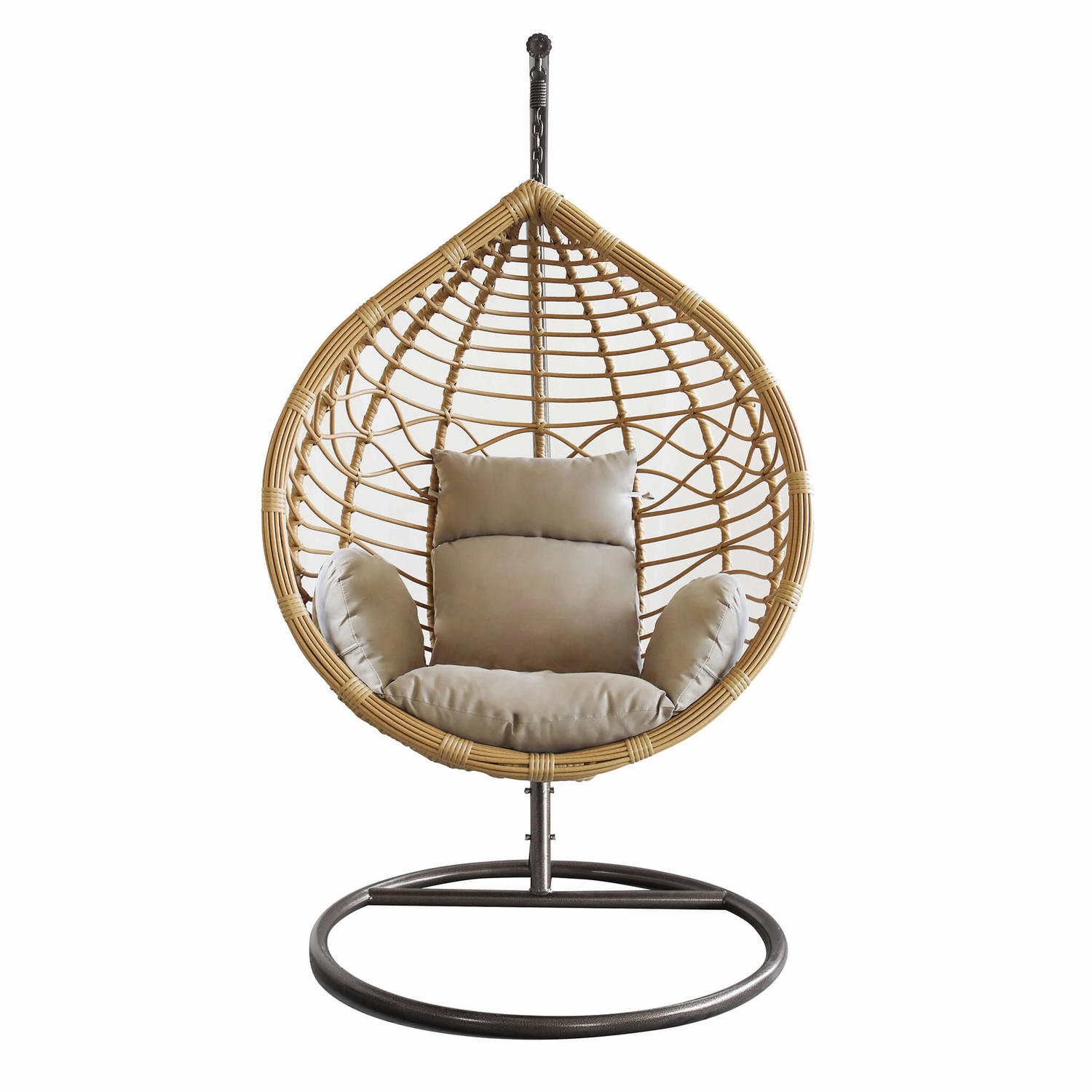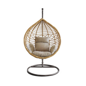 Poltrona sospesa dondolante in polyrattan spazzolato con morbidissimo cuscino imbottito color sabbia per creare una zona relax dal comfort ottimale.