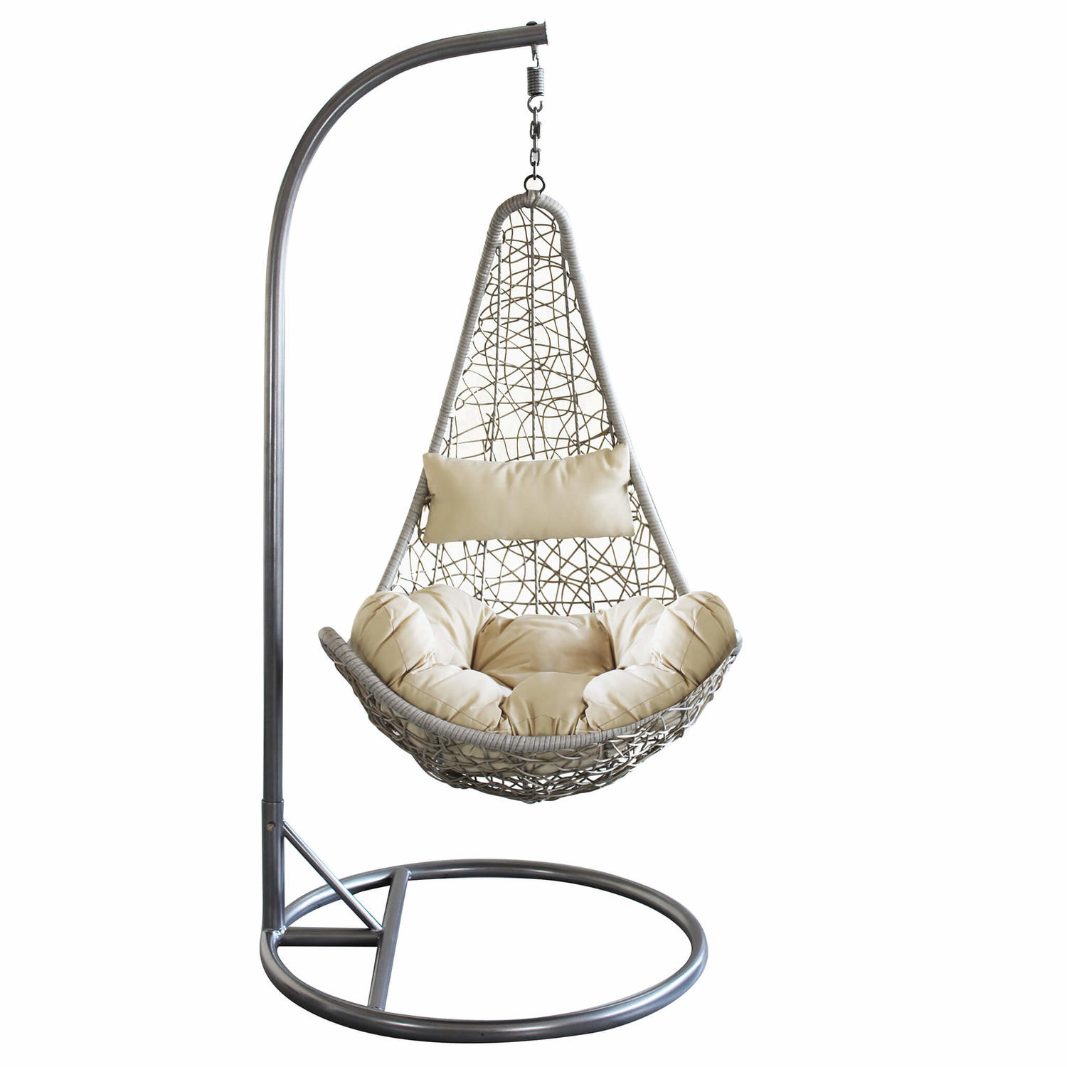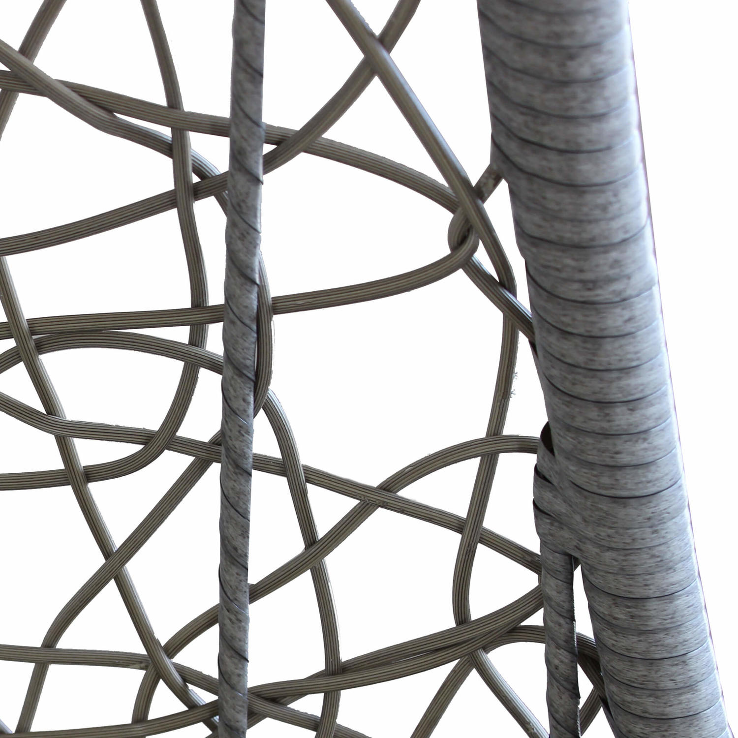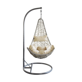 Poltrona sospesa dondolante in polyrattan spazzolato con morbidissimo cuscino imbottito color sabbia per creare una zona relax dal comfort ottimale.