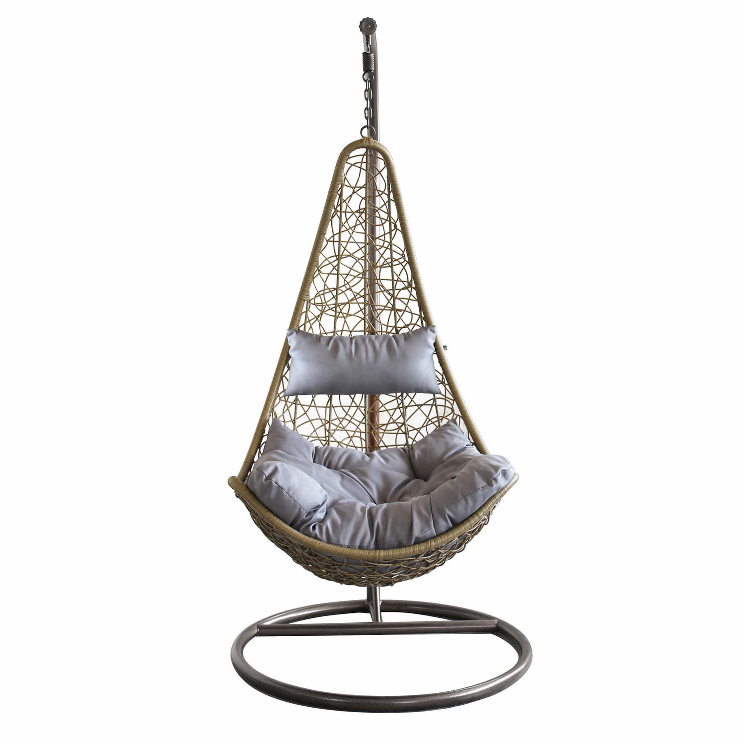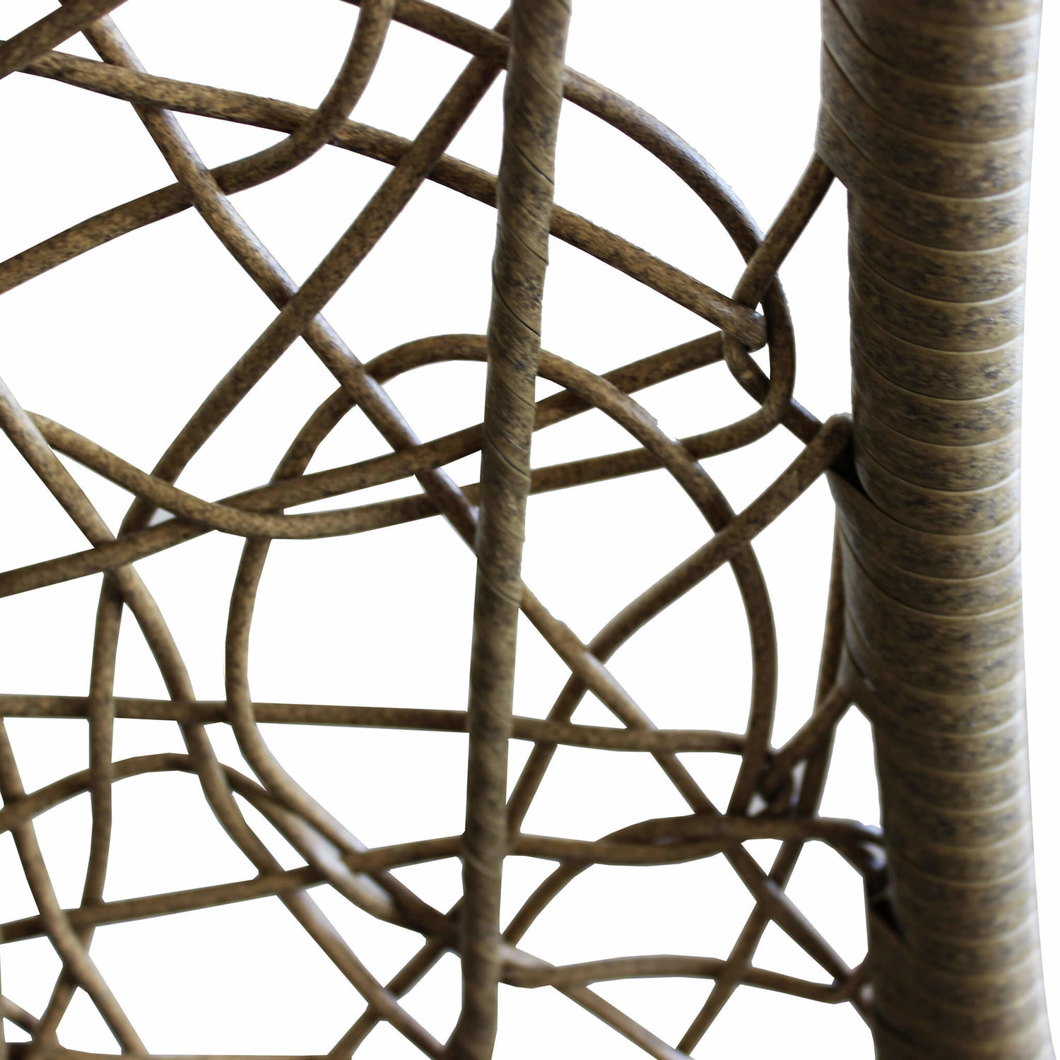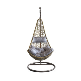 Poltrona sospesa dondolante in polyrattan spazzolato con morbidissimo cuscino imbottito color sabbia per creare una zona relax dal comfort ottimale.