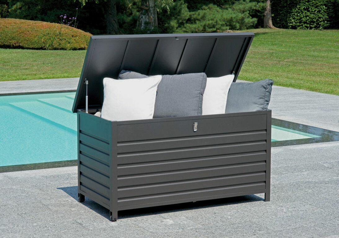 Contenitore porta oggetti da esterno, da posizionare vicino alla piscina, sotto un portico o vicino alla zona living, dove poter riporre in modo sicuro e facile tutti gli oggetti. La struttura è in alluminio di colore antracite o bianca, con ruote annesse. Ciò consente di poterlo agevolmente spostare senza fatica dove più vi è comodo. Le dimensioni lo rendono un articolo molto valido da avere e utilizzare, per rendere lo spazio esterno della casa sempre in ordine e pulito.