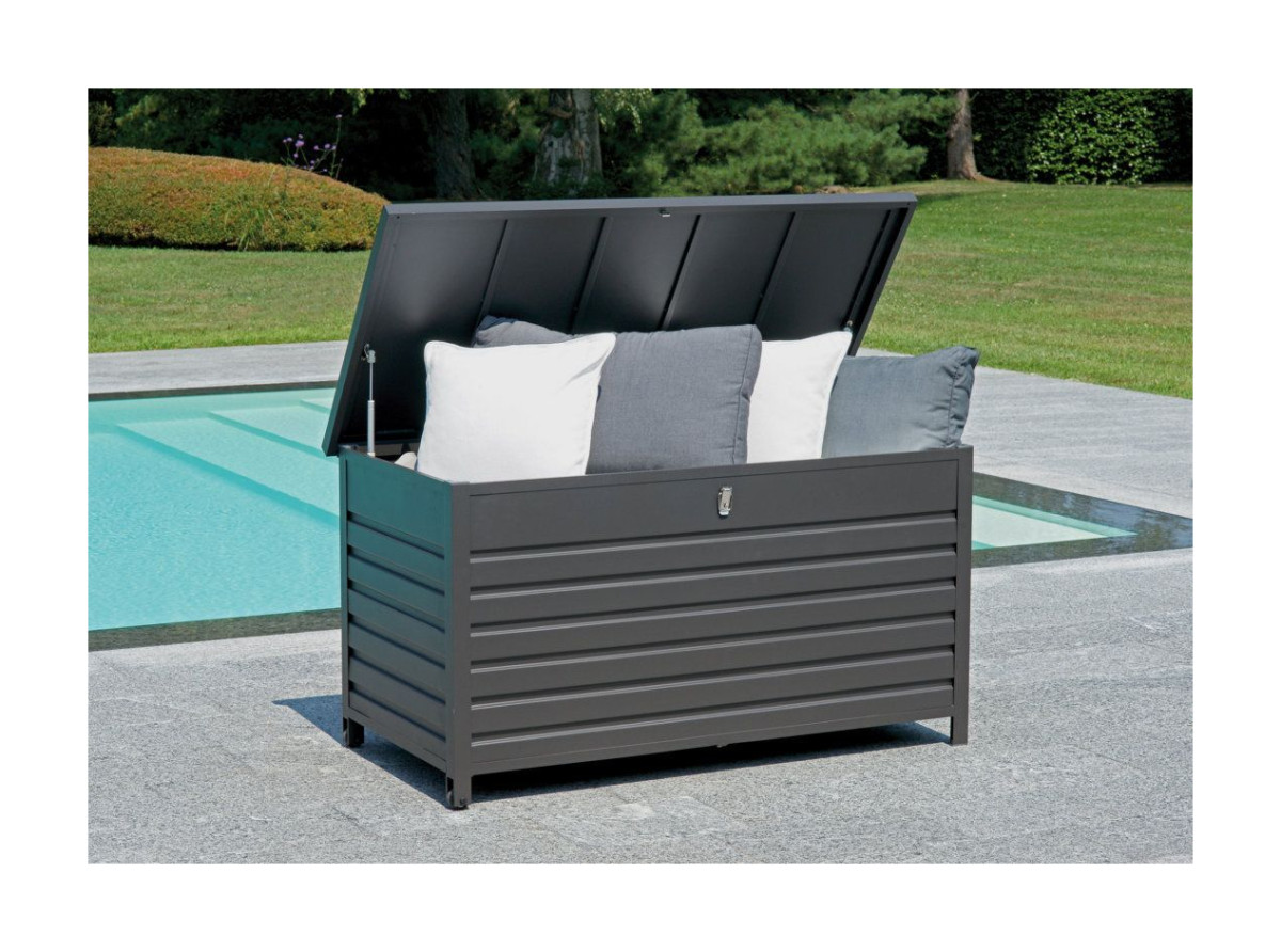Il Box Portacuscini Memphis è realizzato in alluminio (grigio antracite o bianco) e garantisce una straordinaria resistenza agli agenti atmosferici, rendendolo inalterabile allo scorrere del tempo e, grazie alle linee essenziali e pulite, anche all?evoluzione del gusto estetico. Con apertura a pistoni, è dotato di ruote che agevolano lo spostamento e la collocazione in qualsiasi superficie dello spazio outdoor.