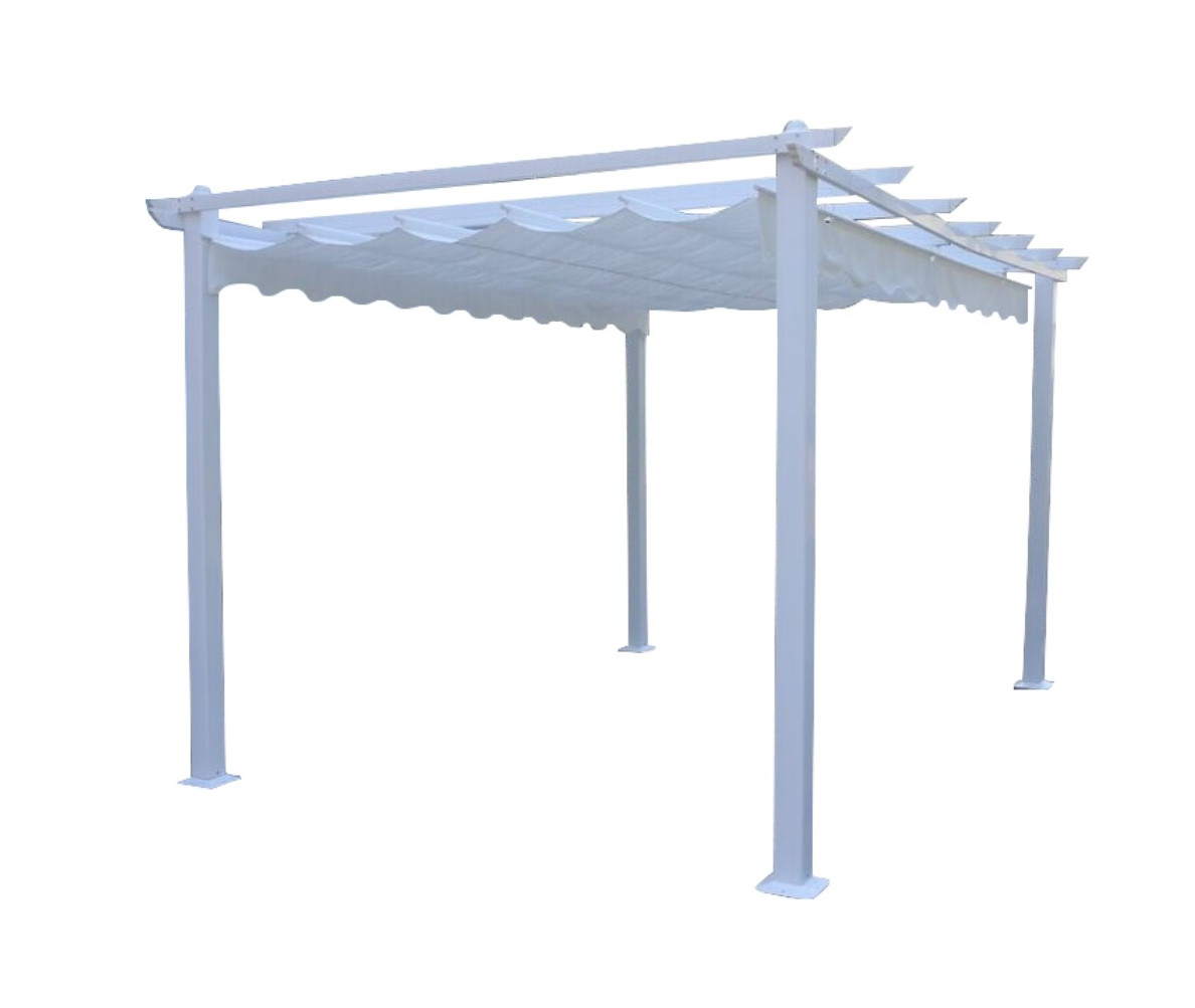Gazebo "ARIETE" E? dotato di copertura richiudibile con sistema a carrucola, basta un semplice movimento per aprire o chiudere il telo. Inoltre la forma ondulata che si vede a telo aperto è veramente particolare e molto elegante. Tutto il sistema scorrevole del tetto è molto resistente e garantisce una lunga durata. La struttura di questo gazebo è estremamente robusta e stabile, i pali sono 100x100mm e oltre a essere molto belli a vedersi conferiscono alla struttura ancora più stabilità. Struttura in alluminio e metallo Rinforzato con una speciale sagoma ad intersezione che conferisce la massima robustezza alla struttura I pali sono da 100x100mm aumentando notevolmente la stabilità della struttura stessa Colore della struttura bianco lucido La copertura è scorrevole in modo da poter essere chiusa in caso di vento forte oppure durante l'inverno quando non si utilizza il gazebo Telo in poliestere colore bianco rinforzato da 180 gr/MQ idrorepellente e resistente agli agenti atmosferici Istruzioni di montaggio incluse Montaggio semplice e veloce Dimensioni Lunghezza 300cm Larghezza 300cm Altezza 230cm