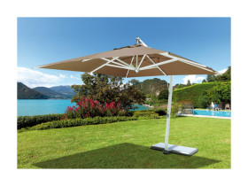 Ombrellone 3,5 x 3,5 m palo laterale - fusto in alluminio 93x93/70x70 mm verniciato uso legno sbiancato - con manovella - poliestere 360 gr color tortora- basamento con due piastrelle in ceramica bianche