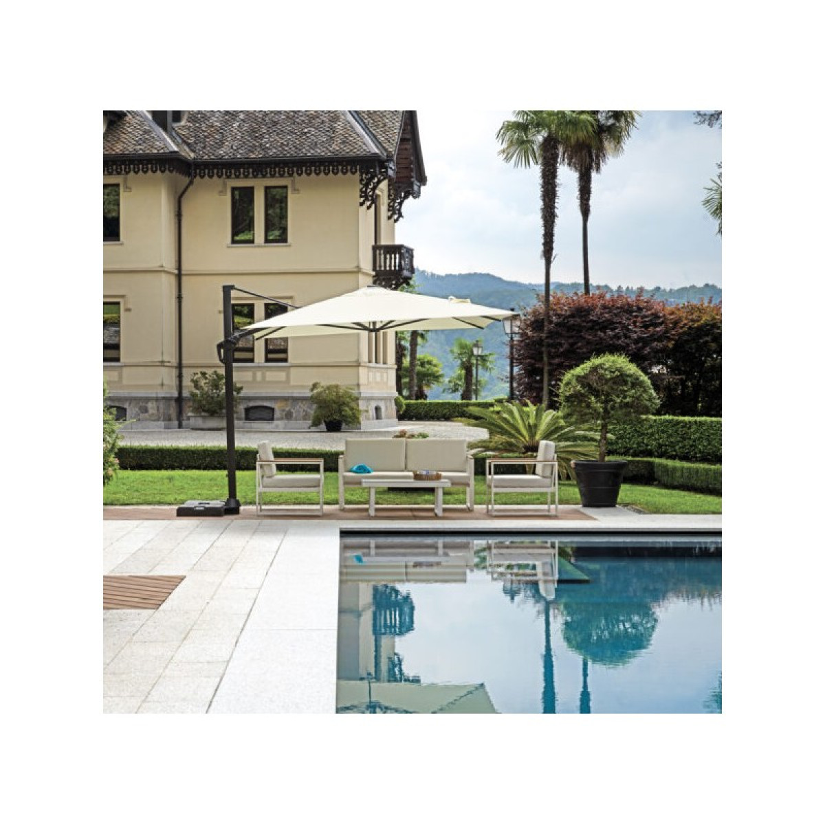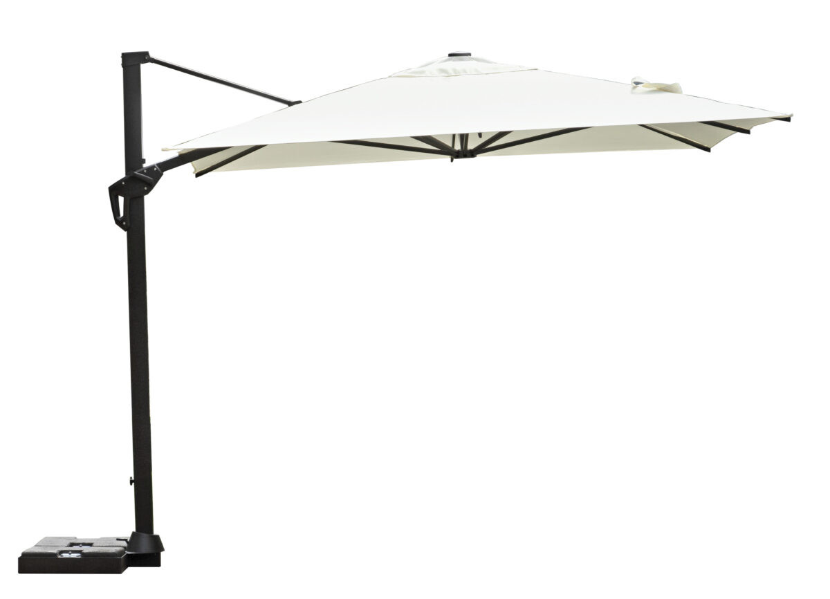 L'ombrellone palo latearale è la soluzione ideale per il tuo giardino o terrazzo. La struttura è in alluminio verniciato antracite, la sua particolare robustezza lo rende adatto anche all'uso contract. L'ombrellone ha 8 bacchette; apertura a manovella; ruotabile a 360° con antivento. Poliestere Ecrù.