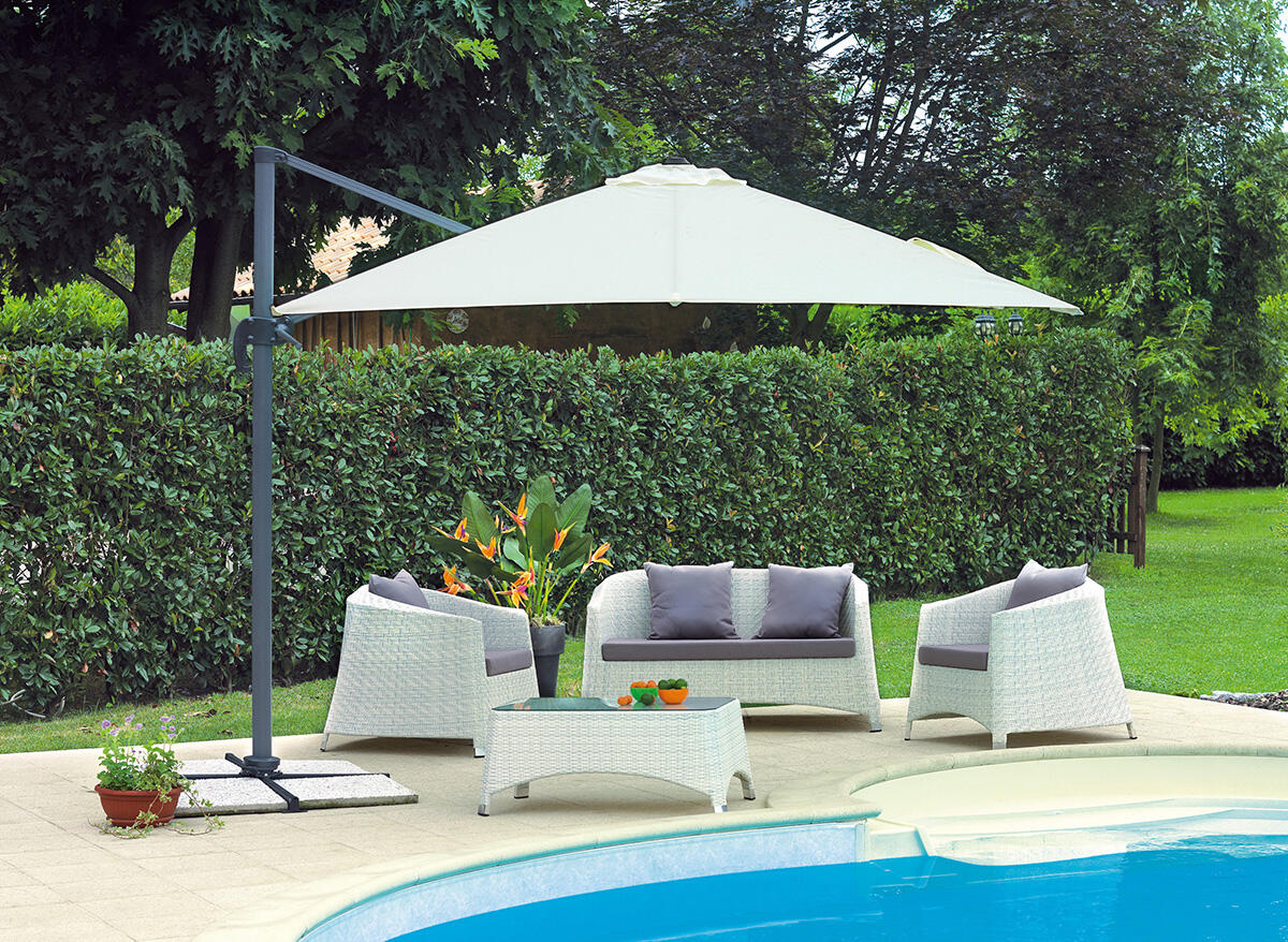 L'ombrellone da giardino con palo laterale garantisce il massimo spazio utile senza alcun ingombro al di sotto dell'ombrellone. La struttura in alluminio offre il meglio in termini di durata e resistenza agli agenti atmosferici. L'apertura è semplificata dal sistema a monevolla che rende l'operazione semplice e scorrevole. Il sistema retrattile limita l'ingombro anche quando non si utilizza l'ombrellone.