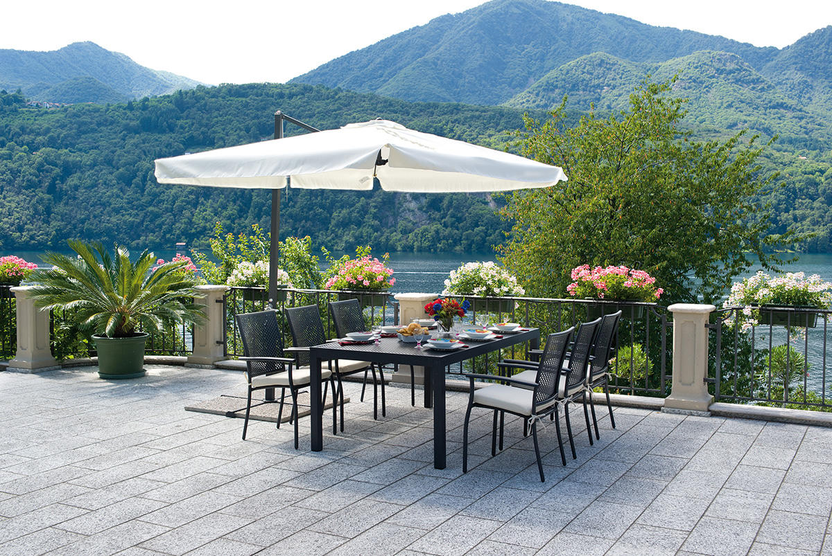 Con palo laterale in alluminio color antracite antracite, meccanismo a manovella e base a croce (piastrelle escluse).