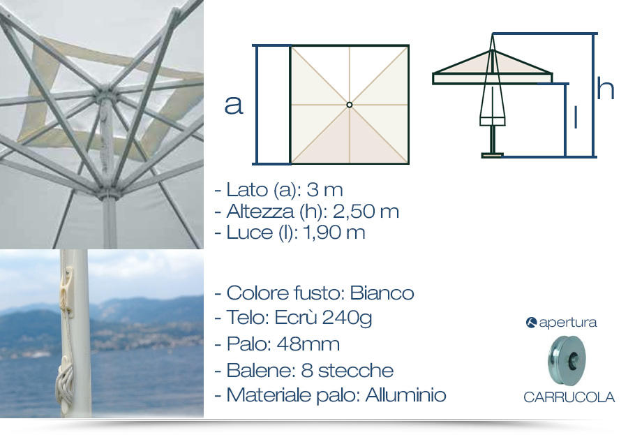 RICAMBIO Ombrellone impermeabile da giardino QUADRATO 3x3 fusto bianco centrale alluminio con carrucola 5051