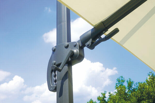 OMBRELLONE CALIFORNIA 3 x 3 mt. CON TILT BASCULANTE - FUSTO ANTRACITE CON MANIGLIONE IN ALLUMINIO - palo alluminio ovale 77 x 53 mm - 8 bacchette 14x24x0,8 mm - ruotabile 360° - con antivento - altezza max con base 2,70 mt - con BASE DECENTRATA - poliestere 250 gr. ECRU?