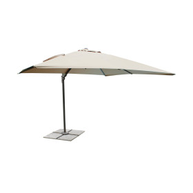 Struttura in alluminio, rotazione a 360° e blocco di posizione. Telo con airvent in poliestere impermeabile 200 gr/mq., meccanismo easy push-up per aprire/chiudere, base di sostegno a croce. Dimensioni 3x2 m, palo 69 x 53