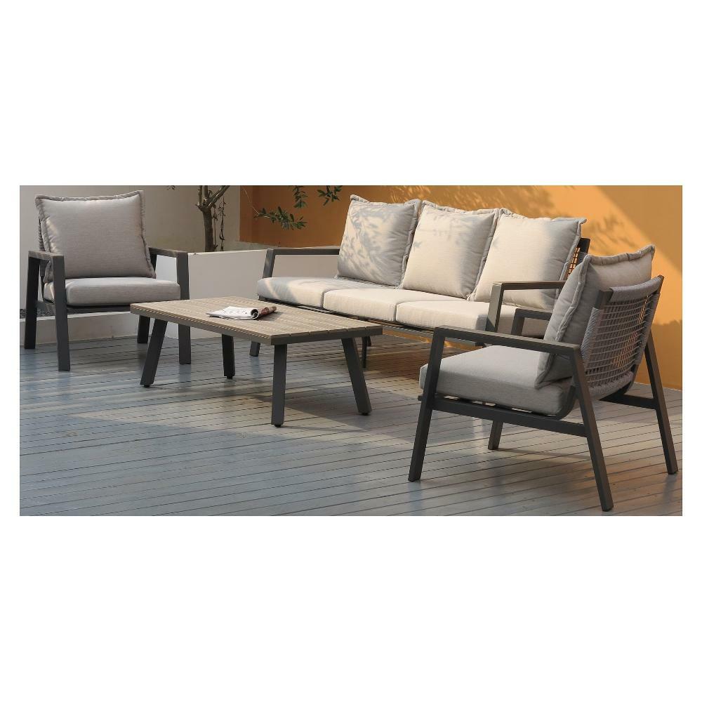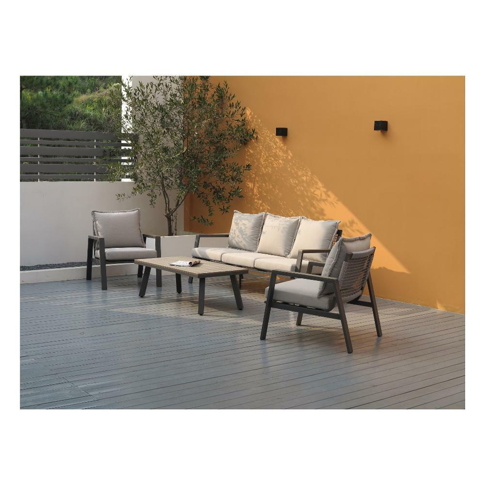 Il salotto da giardino è composto da un divano a TRE posti, due divanetti singoli e un tavolino basso, Grazie alla sua semplicità ed eleganza può essere adattato in qualsiasi spazio esterno per accogliere amici o parenti.