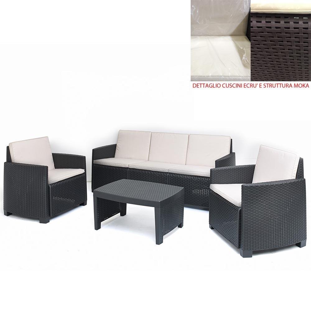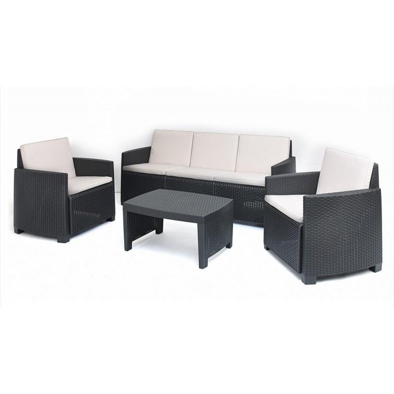 Salotto in resina plastica effetto rattan di colore grigio composto da divano da 3 posti completo di poltrone e cuscini.