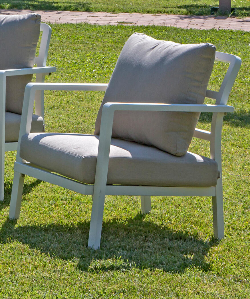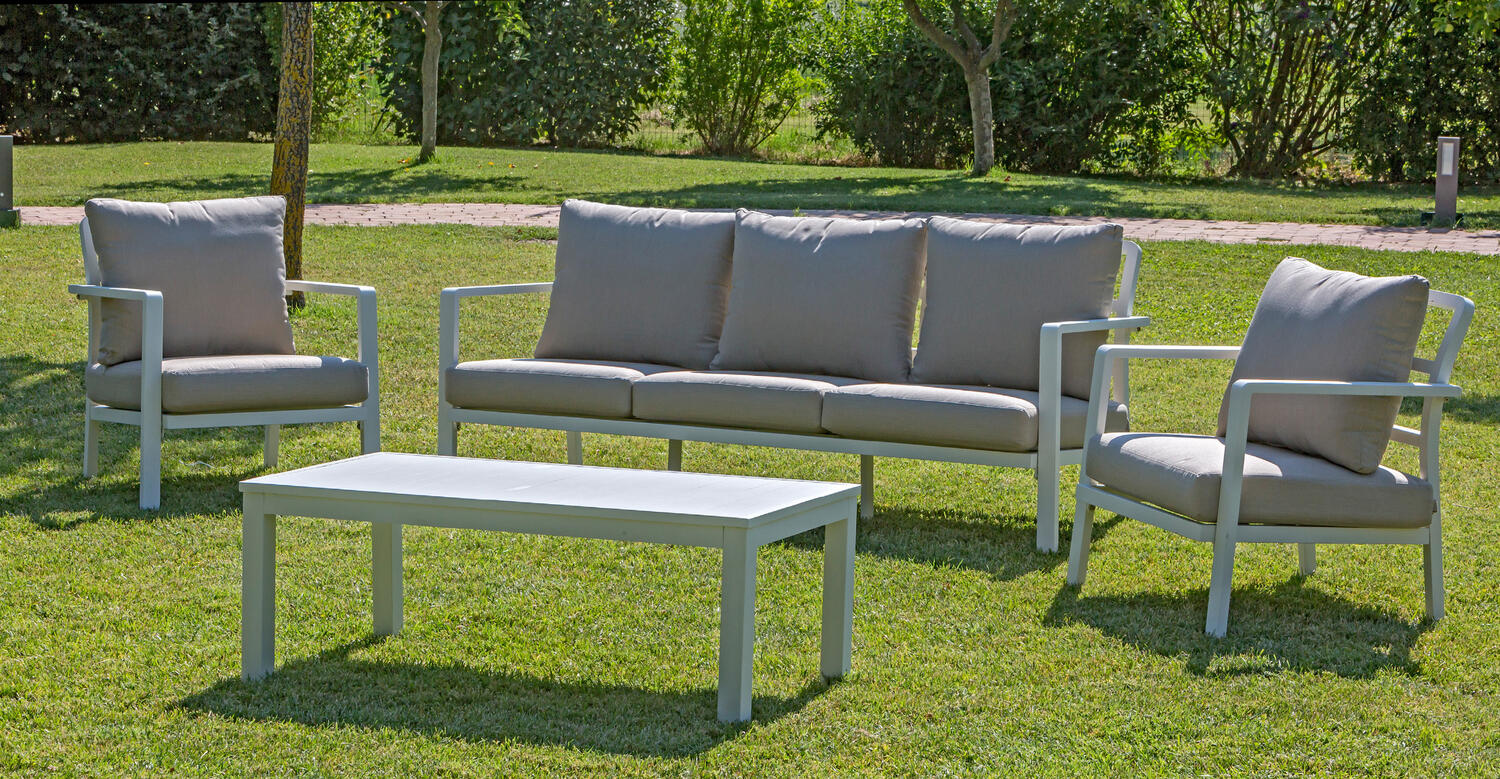 Salotto da giardino in alluminio composto da due poltrone, un divano tre posti e un tavolino rettangolare. Puoi scegliere fra i due colori bianco e sabbia con cuscini abbinati in grigio o sabbia.