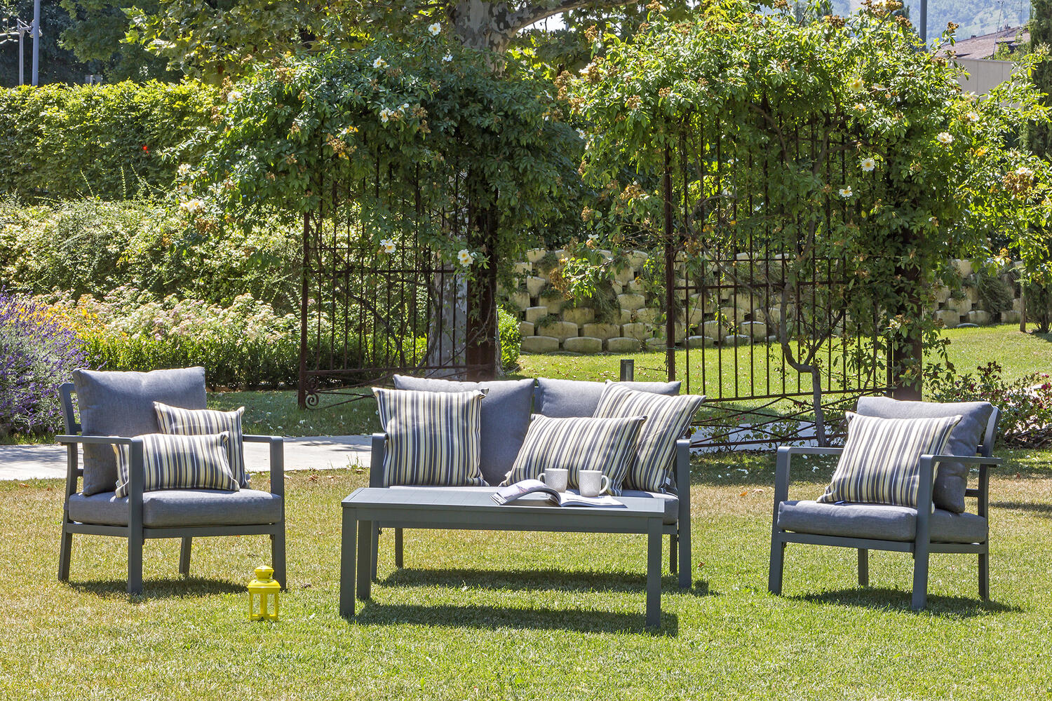 Salotto da giardino in alluminio composto da due poltrone, un divano due posti e un tavolino rettangolare. Il set è disponibile nei colori antracite e tortora con cuscini abbinati in grigio o sabbia.