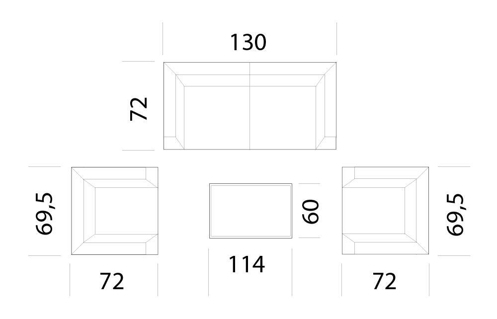 Il salotto AFRODITE in alluminio estruso verniciato a polvere è composto da un divano a due posti, due poltrone con braccioli, un tavolino rettangolare e cuscineria inclusa.