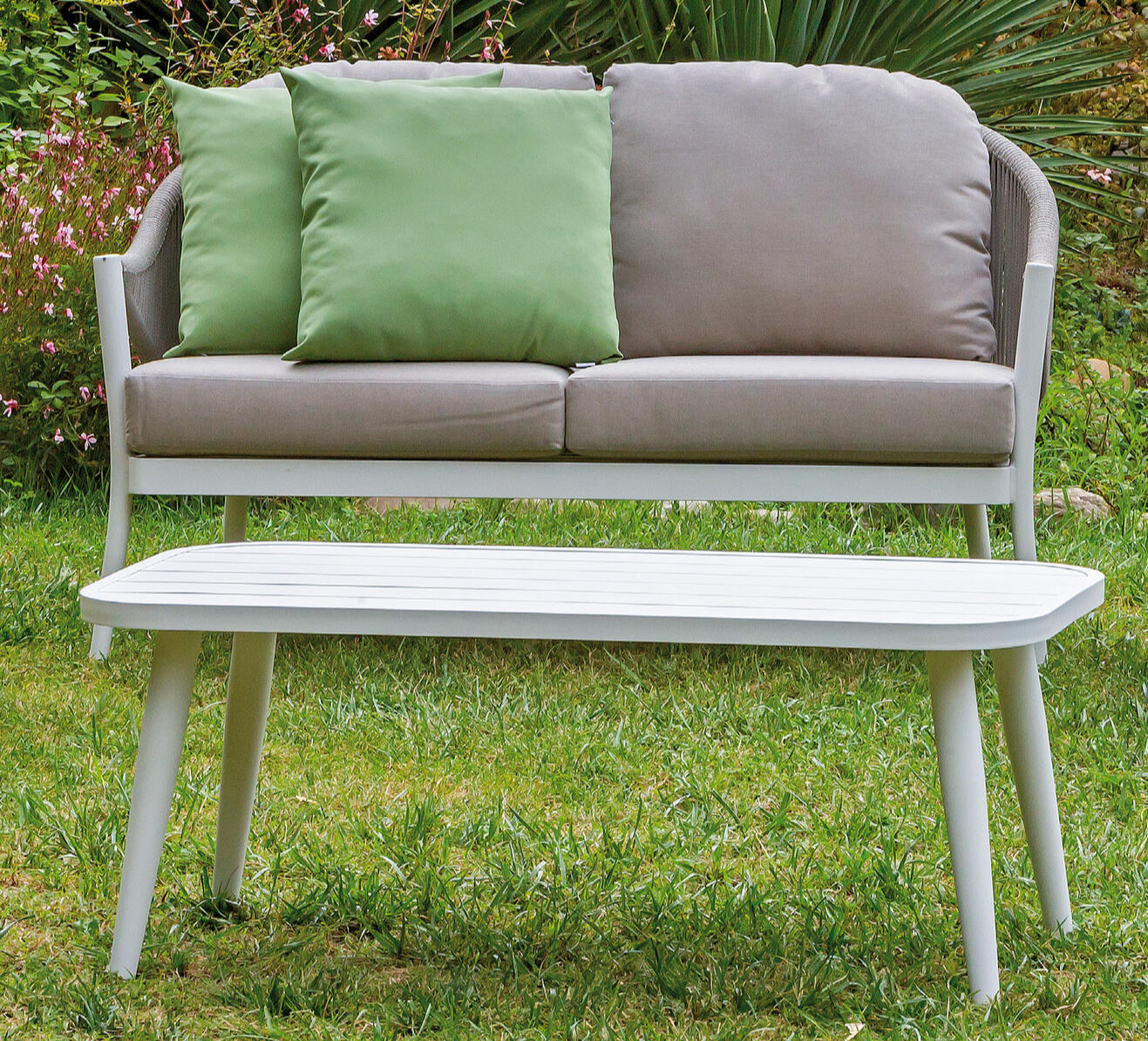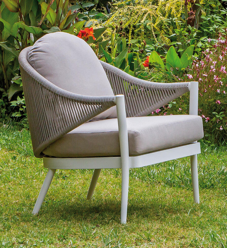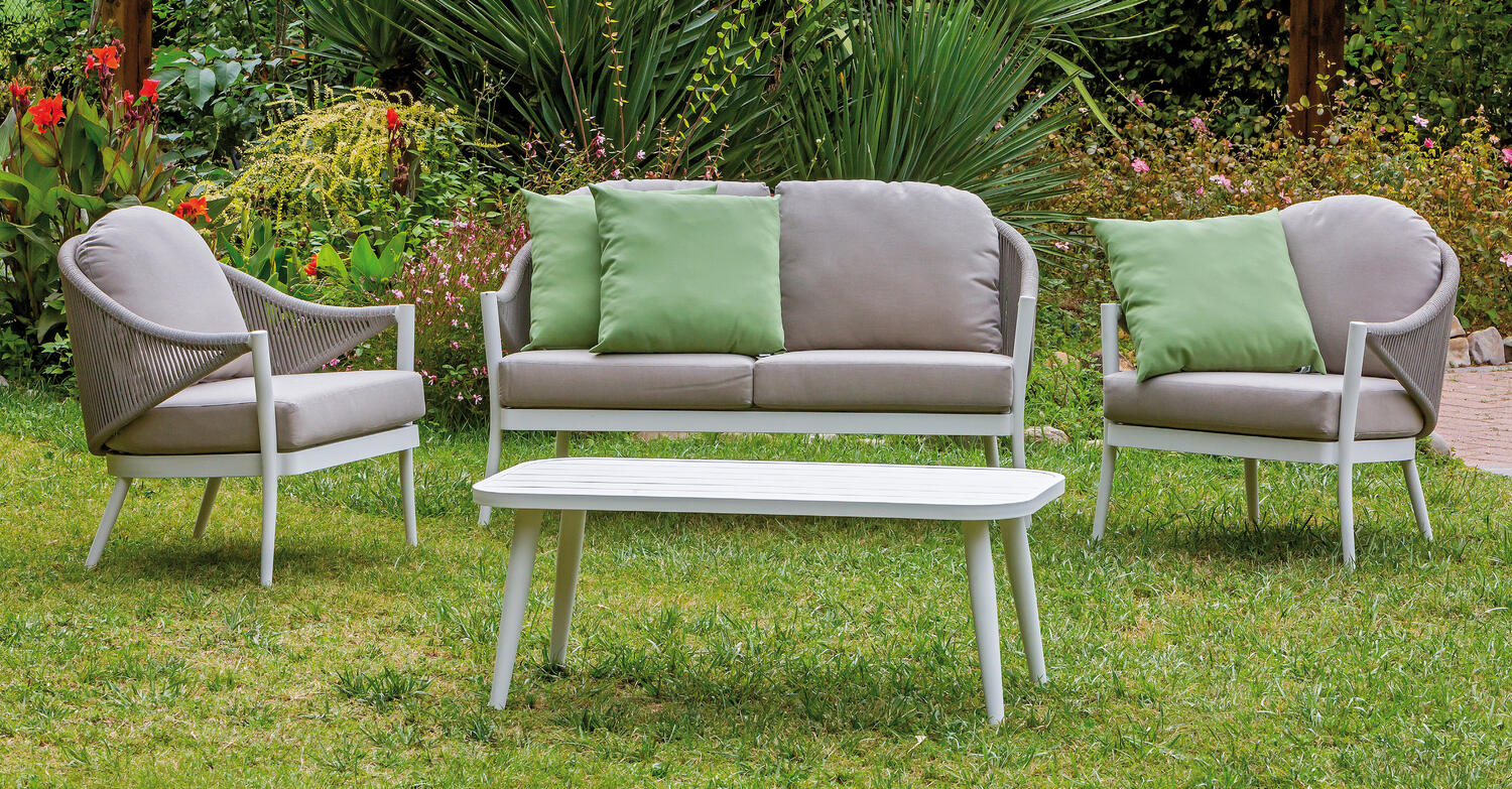 La struttura in alluminio verniciato a polvere in colore bianco è impreziosita dalla combinazione con la corda sintetica color tortora e dalla cuscineria in tessuto poliestere da 230gr color sabbia. Varie nuances delicate si sovrappongono, giocando con volumi leggeri e ariosi che richiamano le fresche atmosfere di un giardino immerso nel verde. Aggiungi al tuo set qualche cuscino del colore che preferisci, per dare un tocco di vitalità caratterizzando l?arredo secondo il gusto e lo stile desiderati.