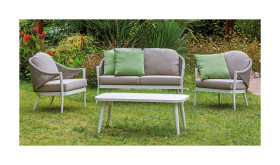 Salotto Nettuno - set composto da 1 divano , 2 poltrone , 1 tavolino - struttura in alluminio verniciato a polvere in colore bianco , corda sintetica colore tortora e cuscineria in tessuto poliestere da 230 gr. colore sabbia -