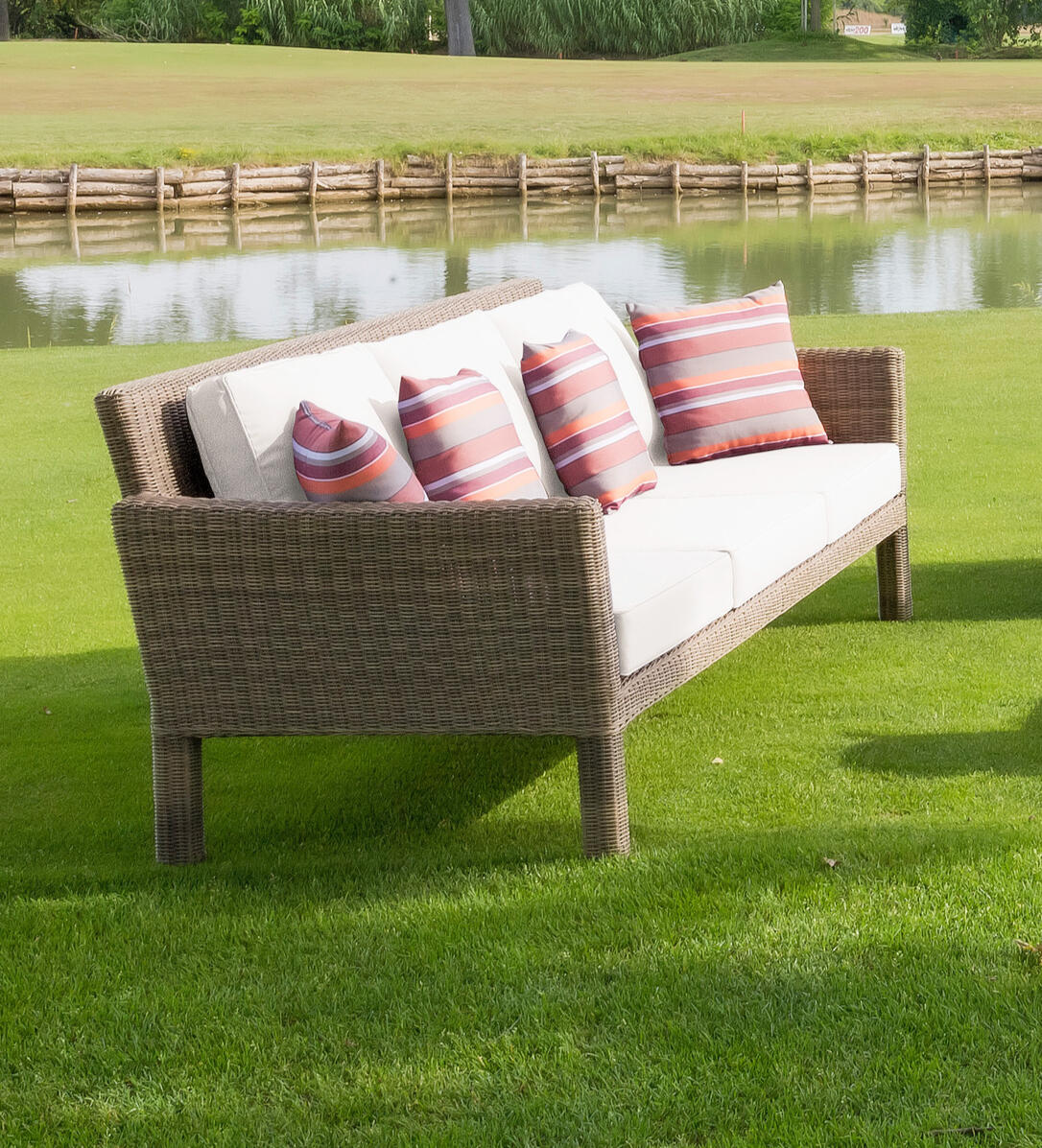 Divano 3 posti realizzato utilizzando fibra pollypel (hdpe) intrecciato ad una struttura in alluminio, creato grazie ad un sofisticato processo per mantenere inalterate le proprie caratteristiche nel tempo. Stile e design sono completati da un'anima eco attenta all'ambiente: il wicker infatti non solo un mateeriale completamente atossico, ma anche riciclabile.