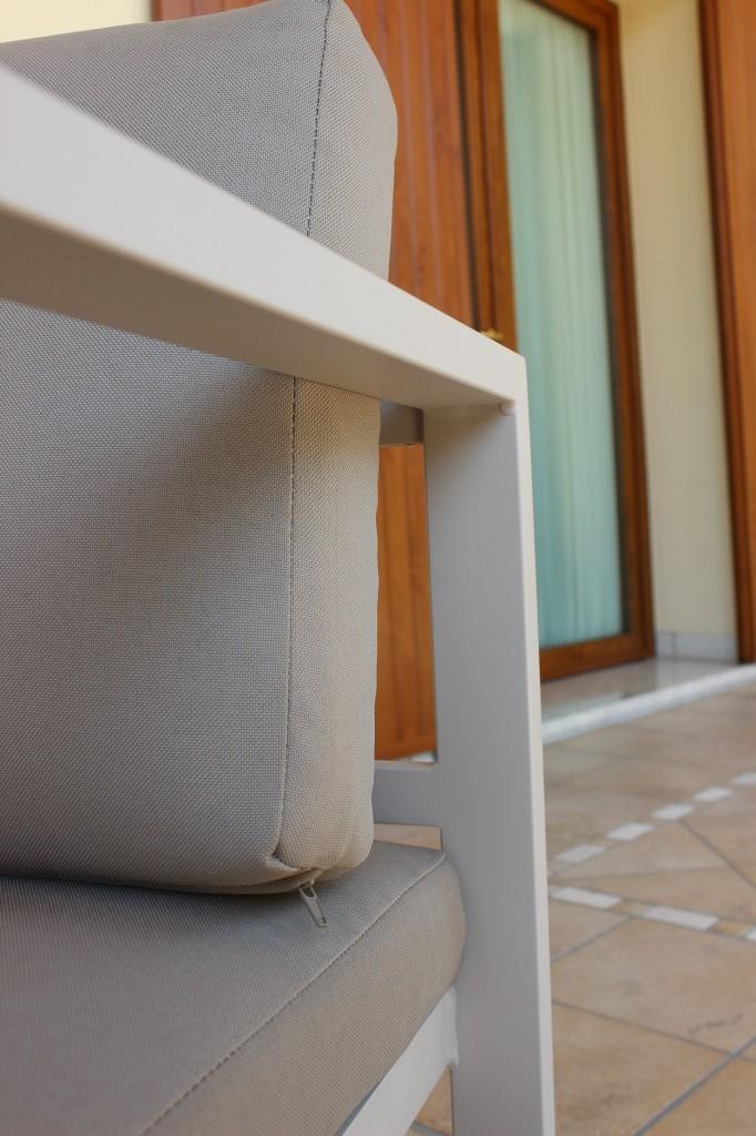 IL SALOTTO TRENTO, nella sua versione standard, è in color bianco, sia per i cuscini sia per la verniciatura dell'alluminio;