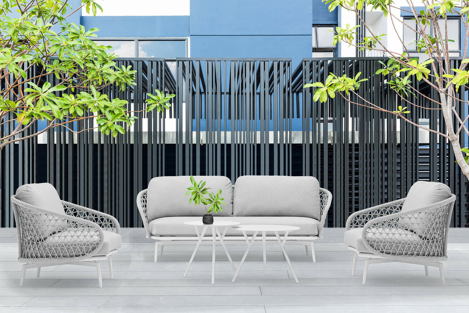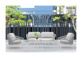 Con la bella stagione, lasciati conquistare dalla voglia di stare all'aperto e in compagnia. fabio.pro ti propone questo set relax, che comprende un divano biposto COMODISSIMO, due poltrone e DUE tavolini basso. La struttura del set relax è in alluminio verniciato a polvere ed è rivestito da un intreccio in corda con fibra sintetica. Il set da relax outdoor è completo di cuscini sfoderabili in finitura GRIGIO MELANGE nel robusto tessuto . I dettagli fanno sempre la differenza e questo comodo set relax da esterno è avvolgente e dotato di braccioli.