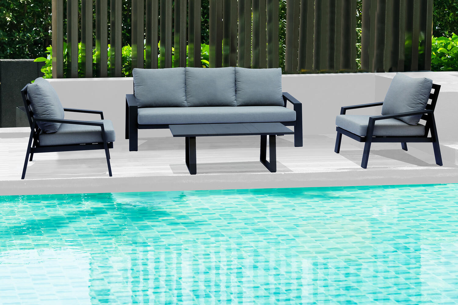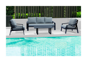 Dotato di telai in alluminio leggeri e resistenti e di un'imbottitura confortevole in poliestere di colore grigio scuro questo set da giardino è l?ideale per arredare con stile il proprio spazio esterno.
