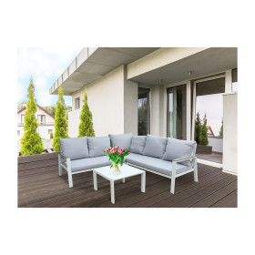 Sfrutta appieno le potenzialità del tuo spazio all'aperto arredando il tuo giardino con complementi d'arredo resistenti e dall'aspetto accattivante e moderno. Come questo set relax composto da un comodo divano angolare con otto cuscini rivestiti in tessuto grigio e un tavolino basso da caffè con struttura in alluminio verniciato bianco.