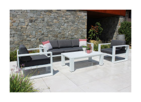 Il salotto IMPERIOSO in alluminio estruso verniciato a polvere è composto da un divano a tre posti, due poltrone con braccioli, un tavolino rettangolare e cuscineria inclusa.