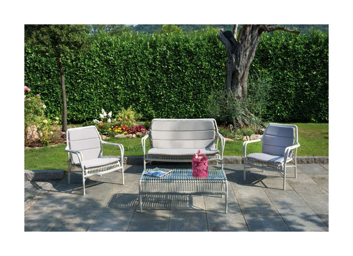Coffee set Camargue: 2 poltrone, un divano, un tavolino 100?50?39 cm con piano in vetro, wicker da ? 12 mm color milk, cuscini grigi.