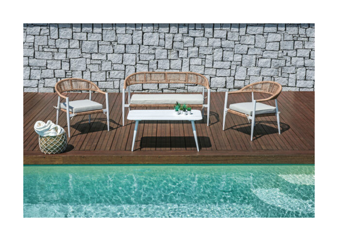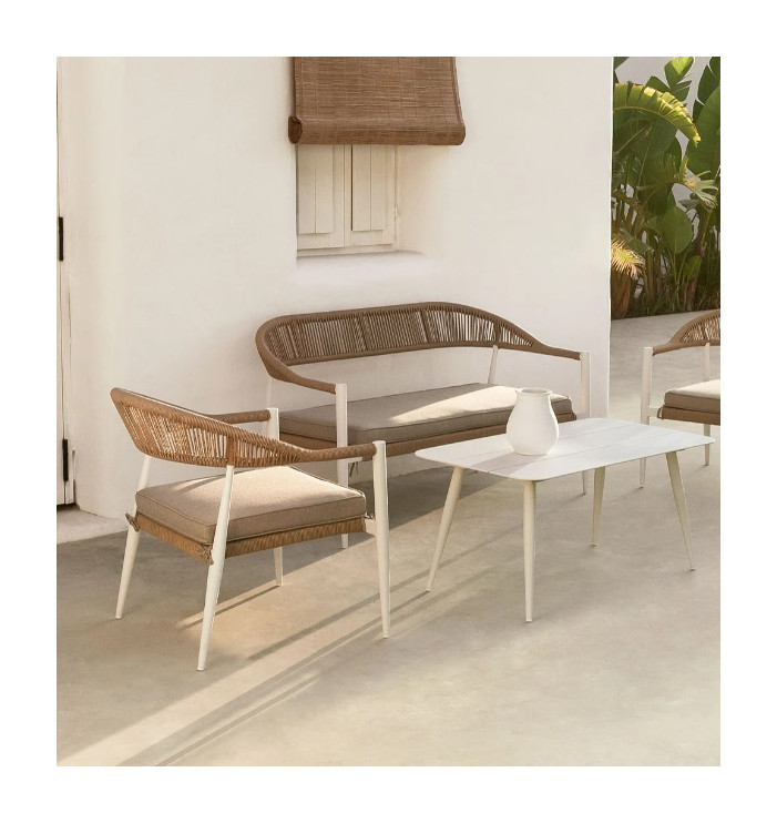 • Un raffinato e grazioso salotto da esterno, realizzato con materiali di alta qualità e ottime rifiniture. Questo set divani da giardino è in alluminio perfetto epr esterno con una lineariità moderna ed essenziale e, data la sua dimensione abbastanza ridotta ma confortevole, è perfetto per arredare spazi esterni non troppo ampi senza creare ingombro ma senza sacrificare estetica e comodità. La linea pulita e sobria da cui è caratterizzato, consente di adeguare questo set divano in alluminio sia ad un arredamento classico che a un arredamento moderno. I cuscini sono sfoderabili in poliestere con speciali trattamenti che le conferiscono un'eccellente resistenza ai raggi UV e agli agenti atmosferici che ne evitano lo scolorimento, l'ingiallimento e l'alterazione. I cuscini sono sfoderabili e lavabili a 30°, mentre per la pulizia generale del salotto basterà utilizzare un panno morbido, acqua e un detergente neutro. Durante la stagione invernale, si consiglia di proteggere il salotto da umidità e pioggia con dei teli adatta cone le cover originali
