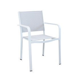 Poltrona impilabile, struttura in alluminio verniciato col. bianco semiopaco, seduta e schienale in textilene grigio