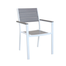 Poltrona impilabile, struttura in alluminio verniciato col. bianco semiopaco, schienale e seduta a doghe in polywood col. grigio