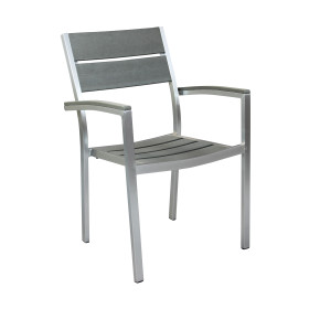 Poltrona impilabile, struttura in alluminio spazzolato, seduta e schienale a doghe di polywood col. grigio