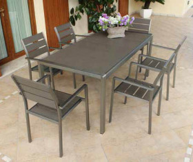 La costante ricerca di prodotti innovativi giunge nell'arredo outdoor, proponendo un nuovo tavolo da pranzo realizzato con struttura in alluminio spazzolato e top in polywood. Il polywood è un particolare materiale innovativo perfetto per l'arredo dei tuoi spazi esterni, siano essi il giardino, la terrazza o il gazebo grazie alla sua grandissima resistenza agli agenti atmosferici.
