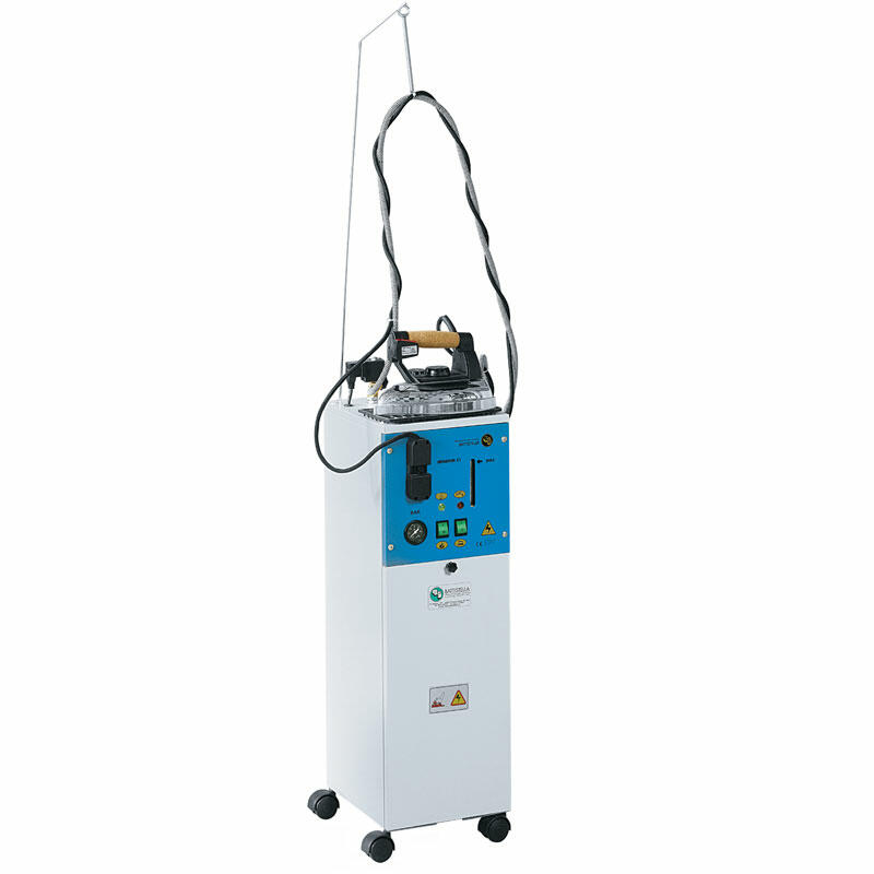 eneratore di vapore con ferro da stiro, valvola regolabile, doppia valvola di sicurezza, termostato di sicurezza in caso di avaria, livello visivo, scarico dell?acqua, segnalatore di mancanza acqua e manometro visivo della pressione (Caldaia da 4,5 l. ? 3,4 l. utili)•