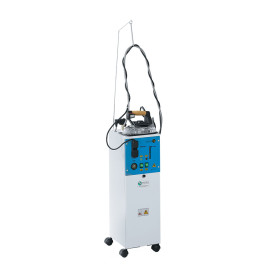 Generatore di vapore con ferro da stiro, valvola regolabile, doppia valvola di sicurezza, termostato di sicurezza in caso di avaria, livello visivo, scarico dell?acqua, segnalatore di mancanza acqua e manometro visivo della pressione (Caldaia da 4,5 l. ? 3,4 l. utili)