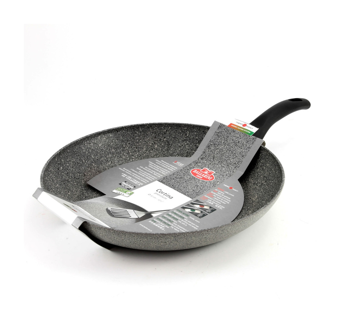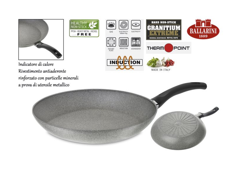La sua superficie di cottura è realizzata con piccole particelle di pietra unite che la convertono nella padella più resistente del mercato. Granitium si riscalda rapidamente e mantiene il calore per più tempo.La superficie in pietra è dieci volte più resistente e dura dieci volte più a lungo dei normali rivestimenti antiaderenti.Quindi non brucia non scolorisce e non si squama.La padella Granitium è perfetta perché può raggiungere alte temperature.E? la migliore padella in assoluto. Esalta il vero sapore del cibo. Con Granitium potete cucinare molluschi frutti di mare cozze ostriche? senza il rischio di rovinarla. Potete anche usare un cucchiaio di metallo senza graffiarla.Potrete cucinare in modo più salutare infatti non occorre aggiungere olio o altri grassi.Con le normali padelle i succhi naturali del cibo fuoriescono e rimangono in superficie.Granitium cuoce il cibo esternamente mantenendone i succhi all?interno. Così la carne e il pesce sono più teneri succosi e gustosi. Le verdure sono più croccanti e cotte alla perfezione.